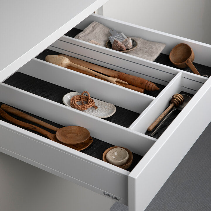 Insatsfack Flex för redskap i vitlackerad metall. Justerbara avdelare. För 550 mm djup låda med innermåttsdjup 524 mm. Passar i låda från bredd 400 mm utvändigt mått.